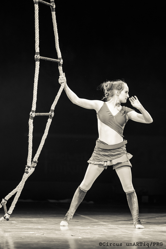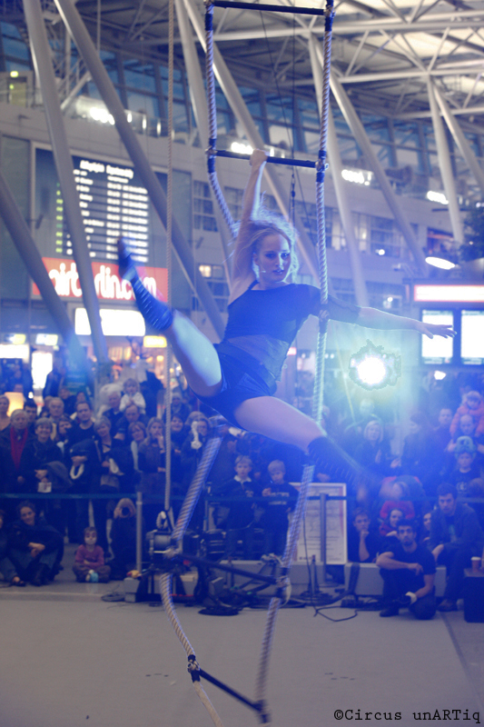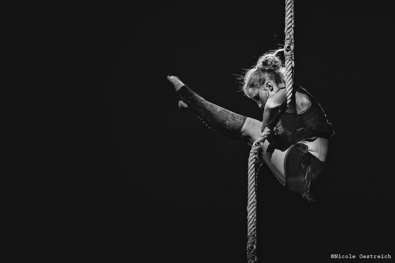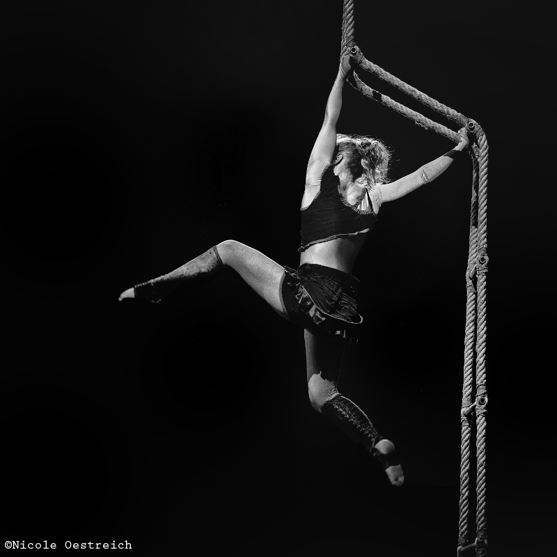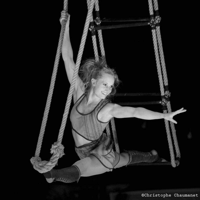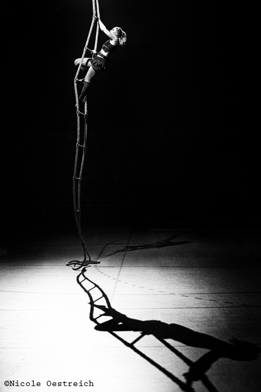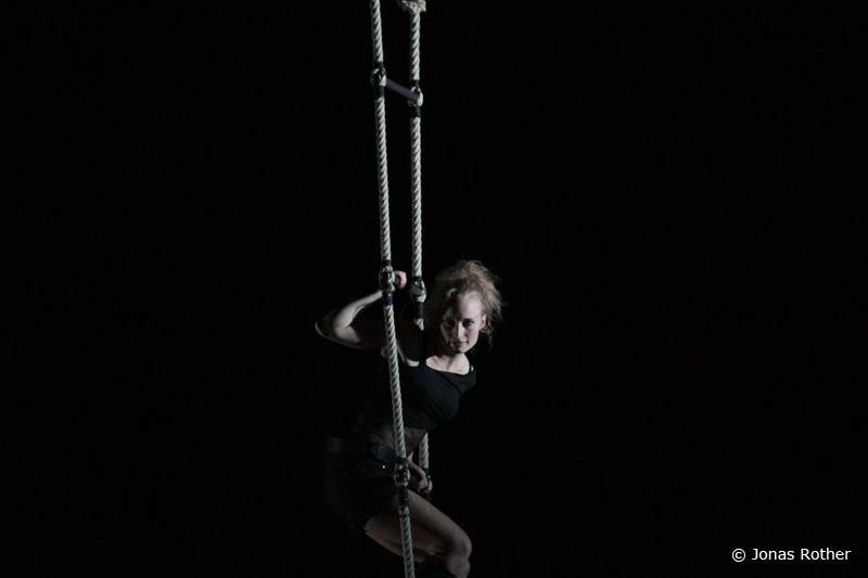 Dans un jeu audacieux plein de force et d'élégance Lisa Rinne met le monde sens dessus dessous évoluant sur son échelle de corde avec un dynamisme surprenant.